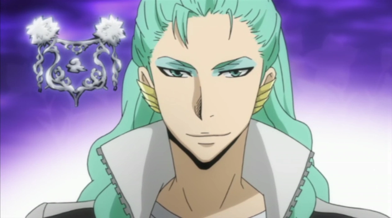 Kikyo has a very effeminate appearance. His sharp, teal eyes are made up with a similar shade of eye-shadow. His long, wavy, mint-colored hair is tied half up, half down and he sports golden cuff earrings. He's dressed in a black uniform jacket with a high collar worn exclusively by the Real Six Funeral Wreaths and matching black pants.